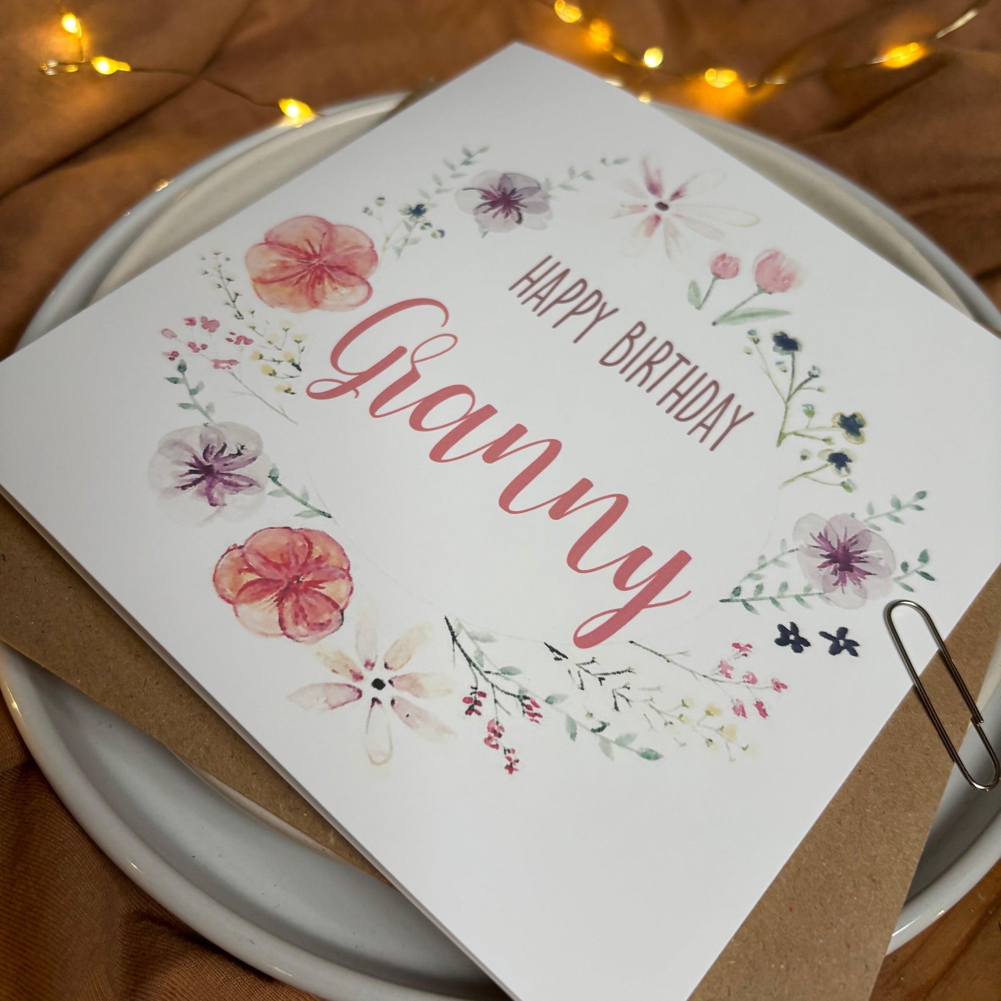 Celebrate your Granny's special day with this Birthday Card, featuring a delicate pink floral wreath design adorned with pressed flowers.