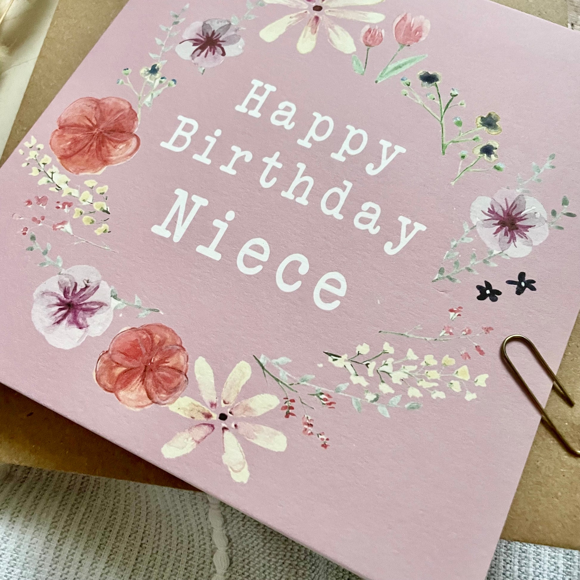 Celebrate your Niece's special day with this Birthday Card, featuring a delicate pink floral wreath design adorned with pressed flowers.